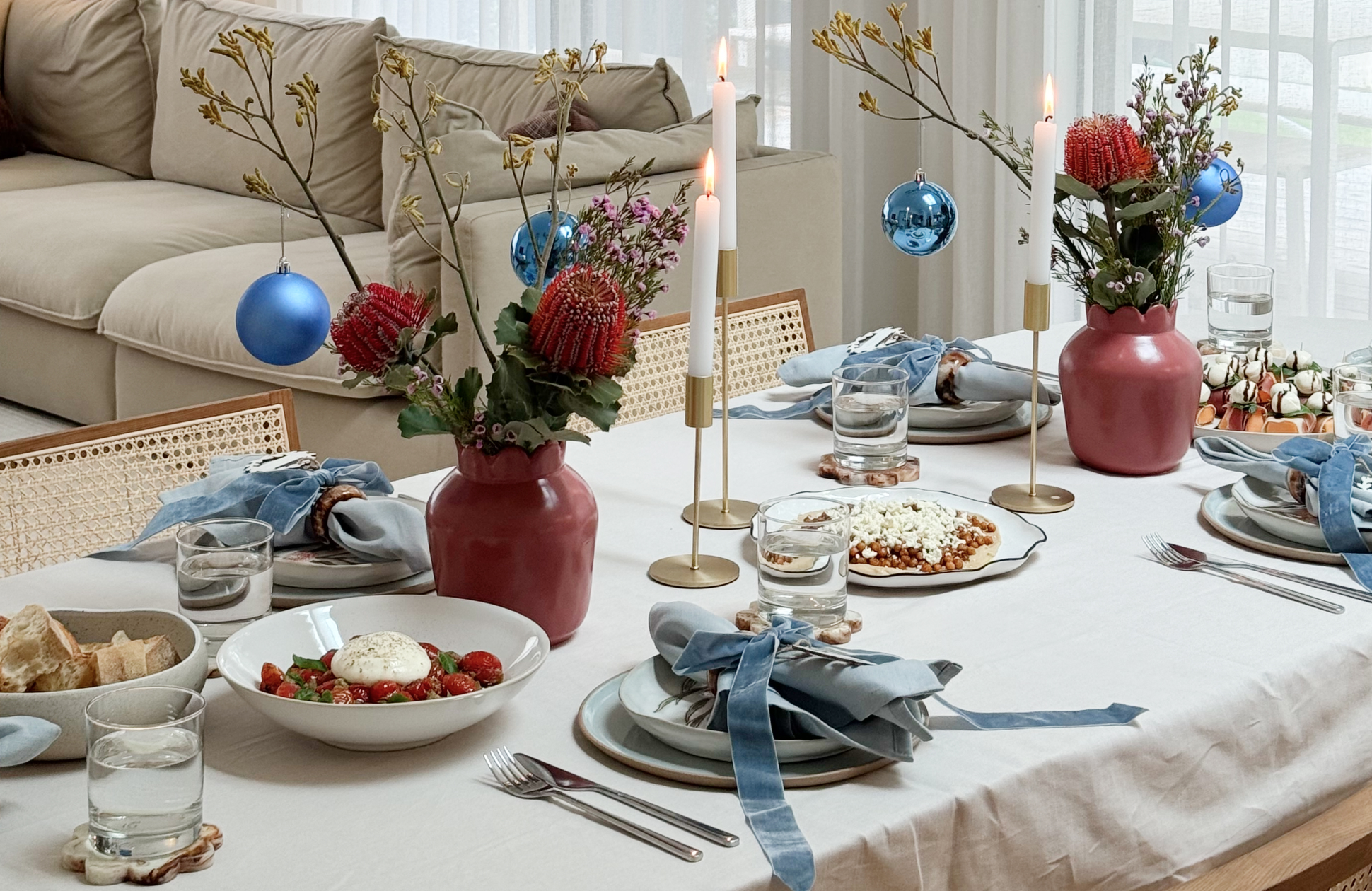 For a modern twist, be inspired by Hannah’s Australian flora table, incorporating native florals into her serving ware and table décor too. You can even add a traditional festive touch by hanging Christmas tree decorations from the floral branches, it’s an easy way to incorporate a touch of holiday spirit to your tablescape without overwhelming the space. Find decorations like these at Bed Bath N Table, Adairs, House Casa Maison Home, The Home Room, Kmart, Big W, Target and fresh florals at Mandurah Forum Florist.